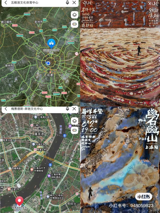易烊千玺为礐嶨演唱会做了几款非遗海报,均来自易烊千玺制作的非遗工艺——瓷板画,通过在生坯上绘制图案,再经窑内1255℃高温烧制而成。 最妙的是,窑温的随机性让釉色自然流淌,每一幅成品都是独一份的艺术品,把不同城市的韵味都藏进了流动的釉彩里,这创意牛的! 有网友发现,两张海报的构图恰好对应演出地点的地图轮廓,而奔跑的小人位置精准指向具体演出场馆,巧妙有趣,不过这点可能只是一个巧合。 “礐嶨”,这两个生僻字,读音为(què xué),取自山石嶙峋之意,与易烊千玺新EP《楔石》在艺术表达上相互呼应。 这次的海报其实很大胆,没有爱豆大头照,只有高温窑烧下形成的流动釉料纹理,既生动展现了 “礐嶨” 的原始意象,暗示每场演出都会像窑变一样充满惊喜。 回顾易烊千玺的单曲封面设计,同样很吸睛。《刘艳芬》专辑封面是以迷幻复古的“红橙黄”渐变色为背景,画面中一个以剪影的形式呈现女人背影,很有氛围感。 《陷落美好》以丙烯手绘斑斓山脉,星月湖泊悬浮于夜空。颜料堆叠的厚重感与歌名字体的手写温度,将“美好”具象为可坠入的梦境。